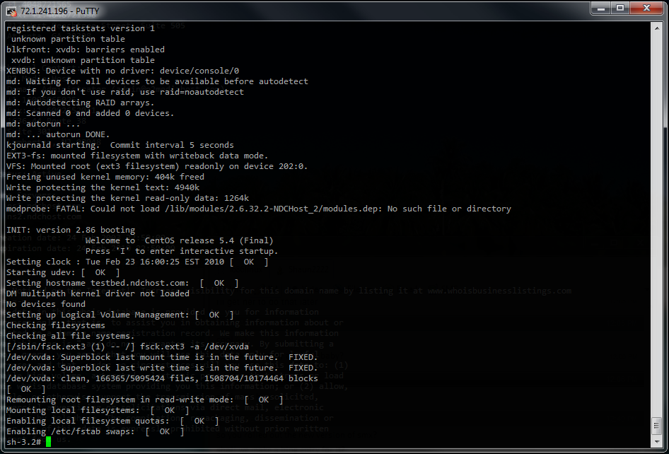 5. Once logged into the console, type the word console to connect to the virtual terminal console. Once the reboot cycle is complete you will be at a screen with a shell prompt that looks like the following: